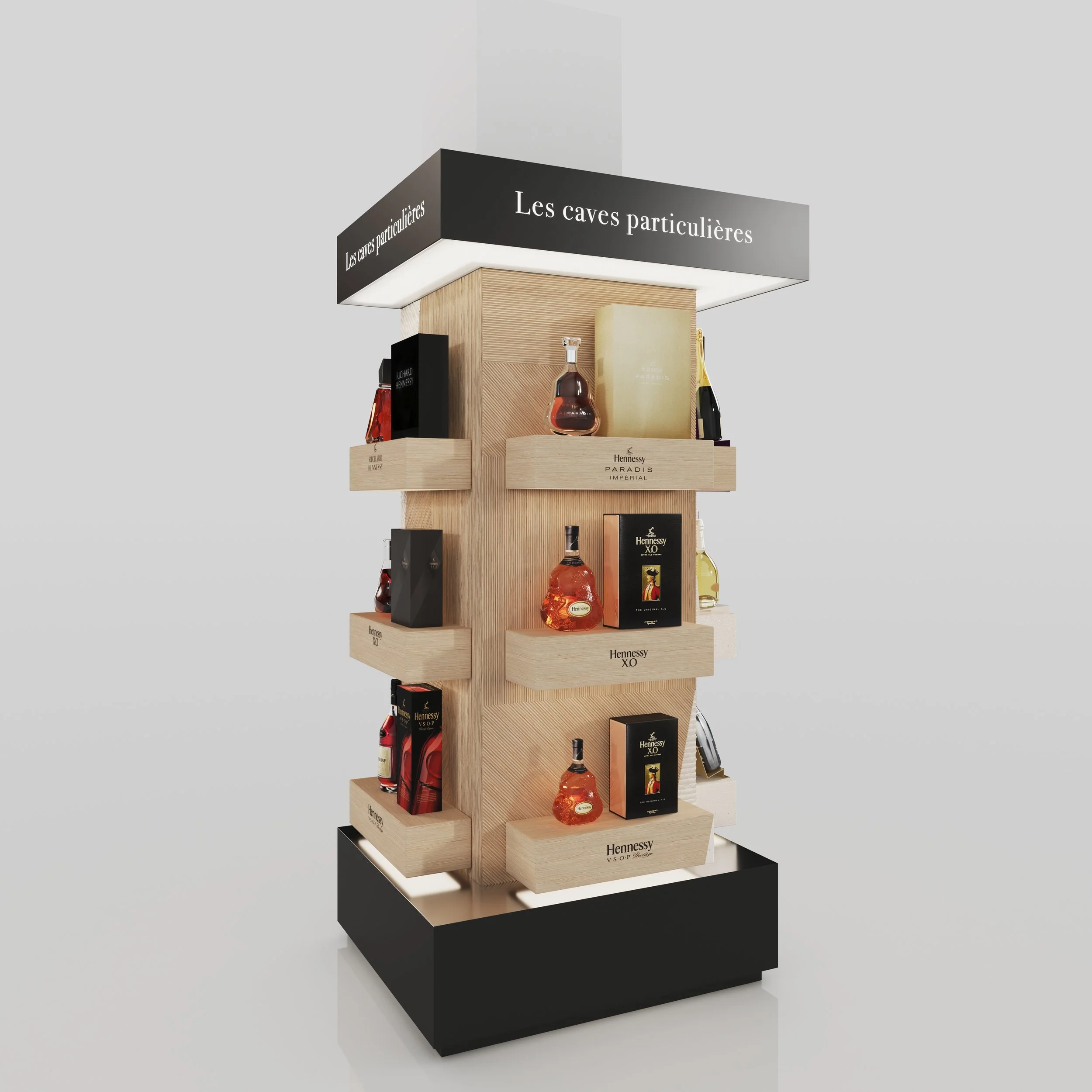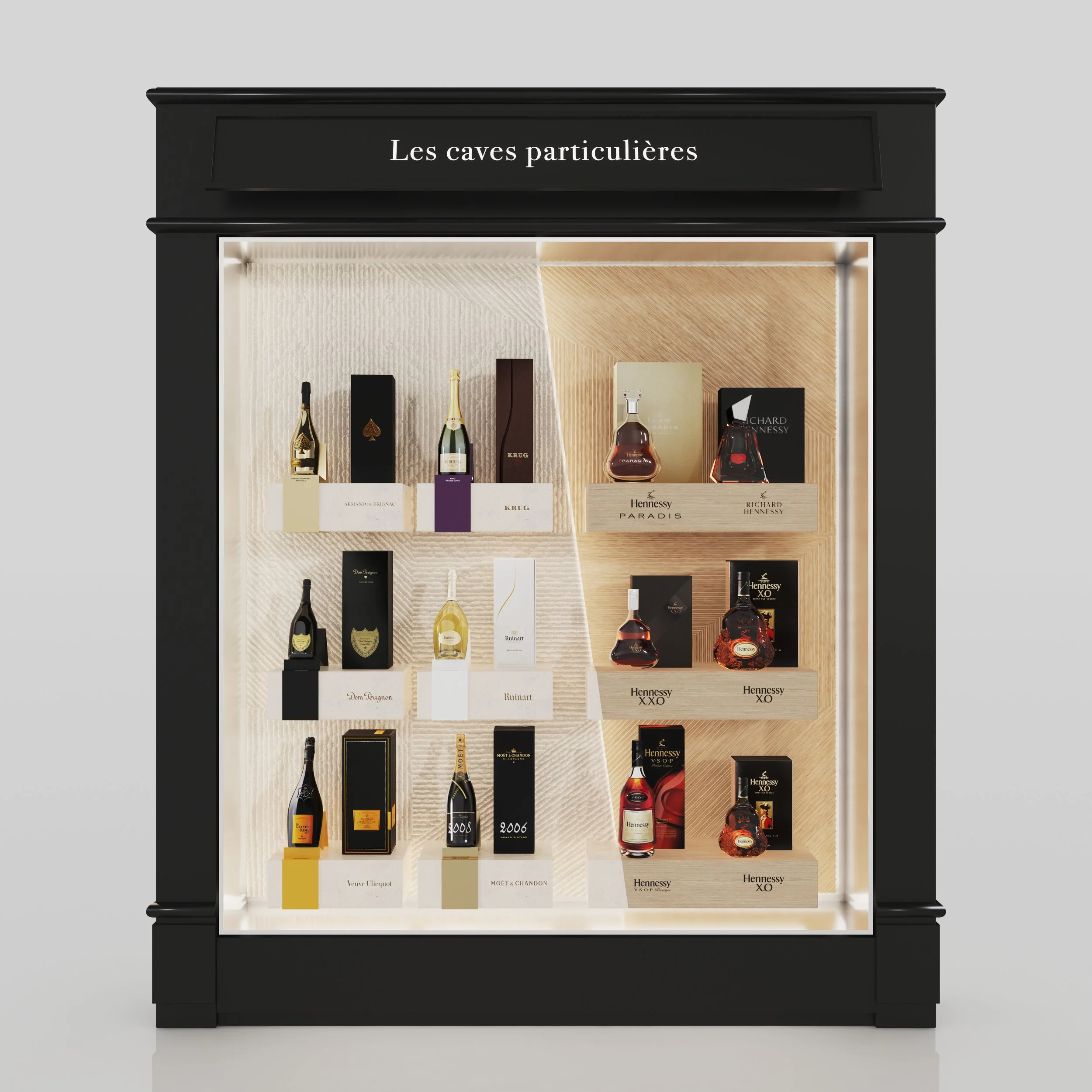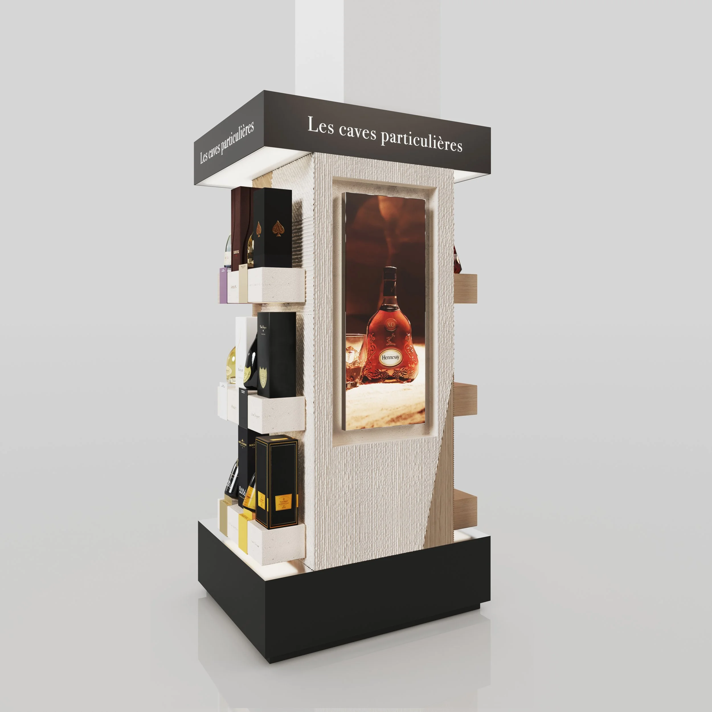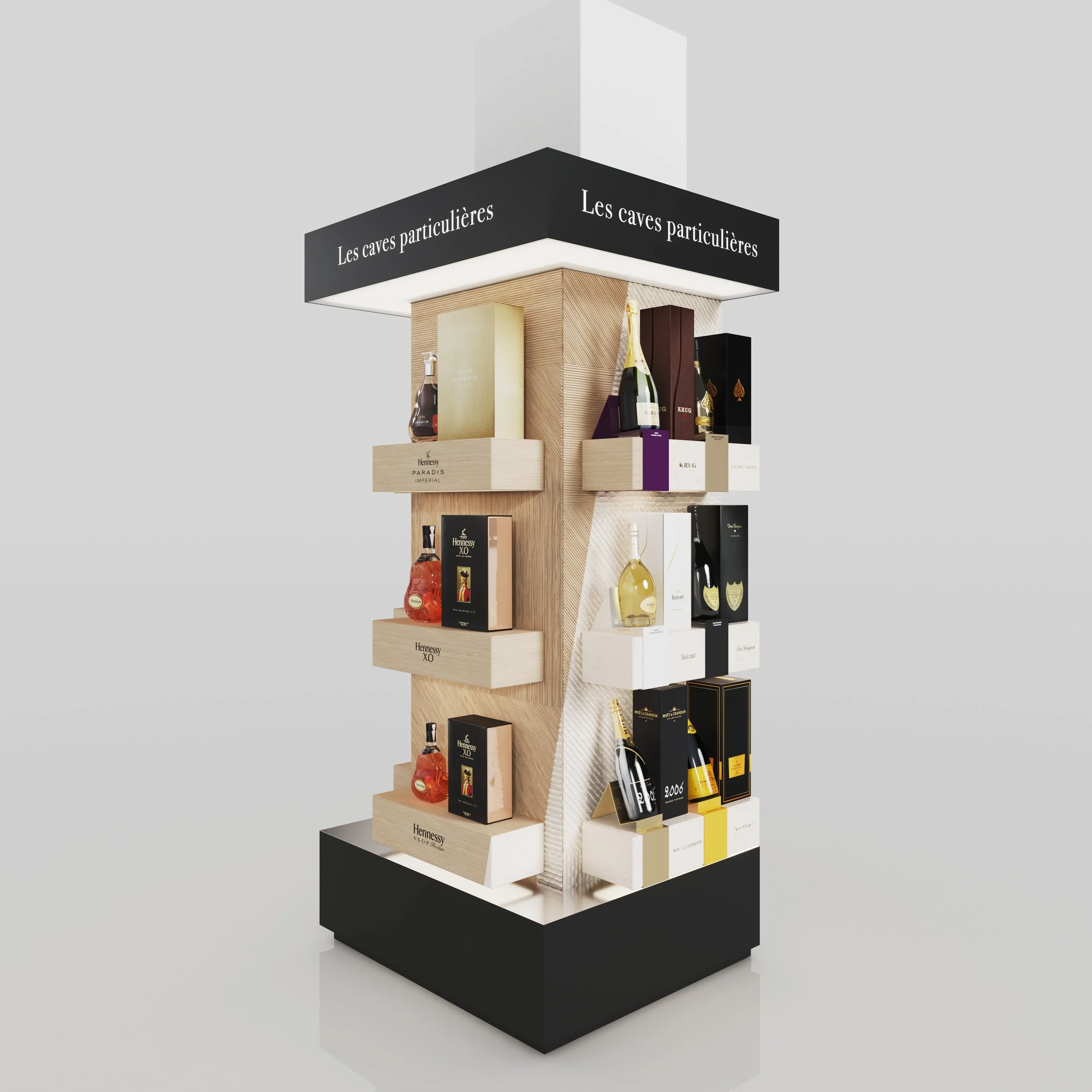 Projet basé sur l’identité imaginée pour la boutique “Les Caves Particulières” mélangeant le calcaire de la région champenoise et les futs de chêne utilisés pour le vieillissement du cognac.